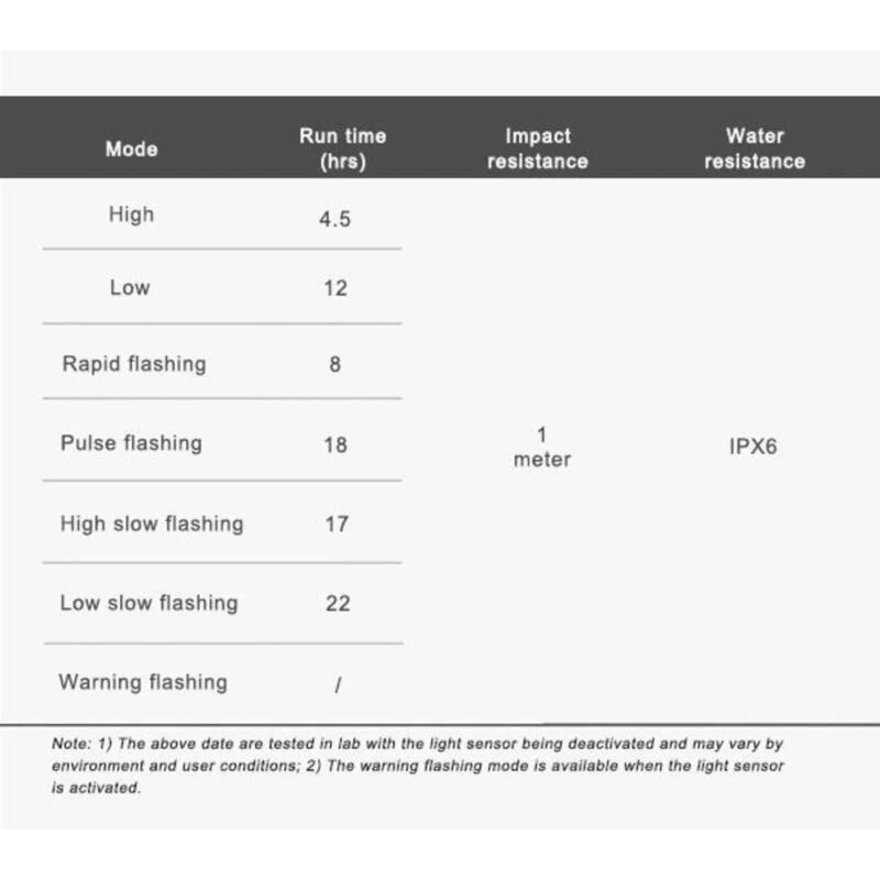 LED: COB LED à haut rendement. Batterie: batterie Li-polymère rechargeable 200mAh / 3,7V. Dimensions (unité lumineuse): 42.5mm (L) * 23.5mm (W) * 43.5mm (H); Poids (unité lumineuse): 23 g. Bague de montage: compatible avec les tubes de selle de 24 à 36mm et tubes aéro